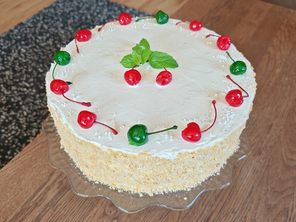 Połączenie kakaowego biszkoptu, lekko kwaśnego kremu wiśniowego i delikatnego kremu pełnego białych michałków.