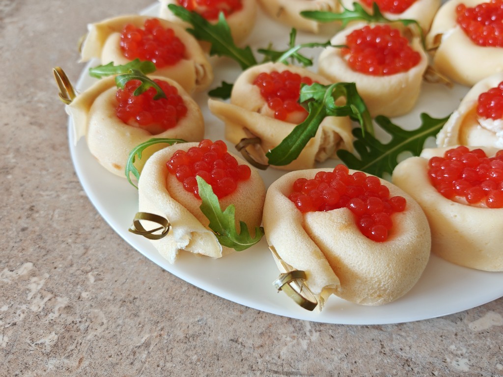 Delikatna, wykwintna przekąska łącząca miękkie, cienkie naleśniki z kremowym nadzieniem i subtelną słonością kawioru.