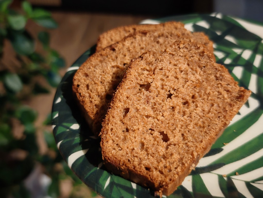 Zmieszaj ze sobą mąki, sodę, proszek, przyprawy i sól. Ubij jajka z cukrem. Dodaj mus jabłkowy, kefir, olej. Dodaj suche składniki do mokrych i wymieszaj. Ciasto przełóż do długiej foremki wyłożonej papierem do pieczenia i wstaw do piekarnika nagrzanego do temperatury 180 stopni. Piecz przez około 50 minut, do suchego patyczka.