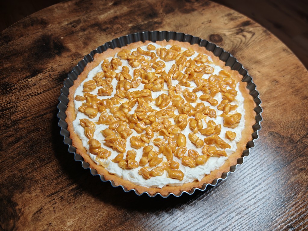 Pyszna tarta na chrupiącym, orzechowym spodzie, z delikatnym kremem śmietankowym i orzeszkami w karmelu...